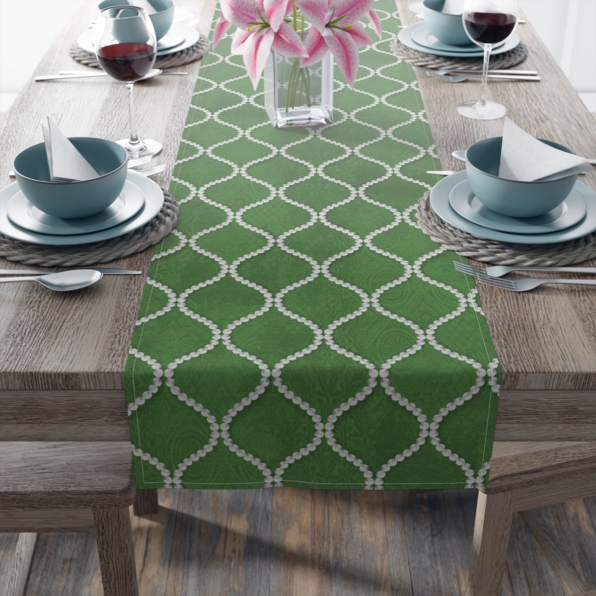 Enhance your dining experience with our Printed Abstract Wavy Line Pearls Dark Green Dining Table Runners. Made from high-quality materials, these vibrant runners feature a morccan pearls pattern that adds a touch of elegance to any table setting. Whether hosting a dinner party or simply enhancing your everyday decor, these table runners are the perfect addition. Elevate your style and create a captivating ambiance with our Abstract Wavy Line Pearls Dark Green Dining Table Runners.