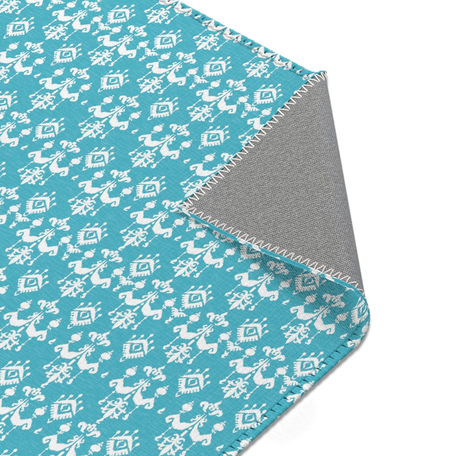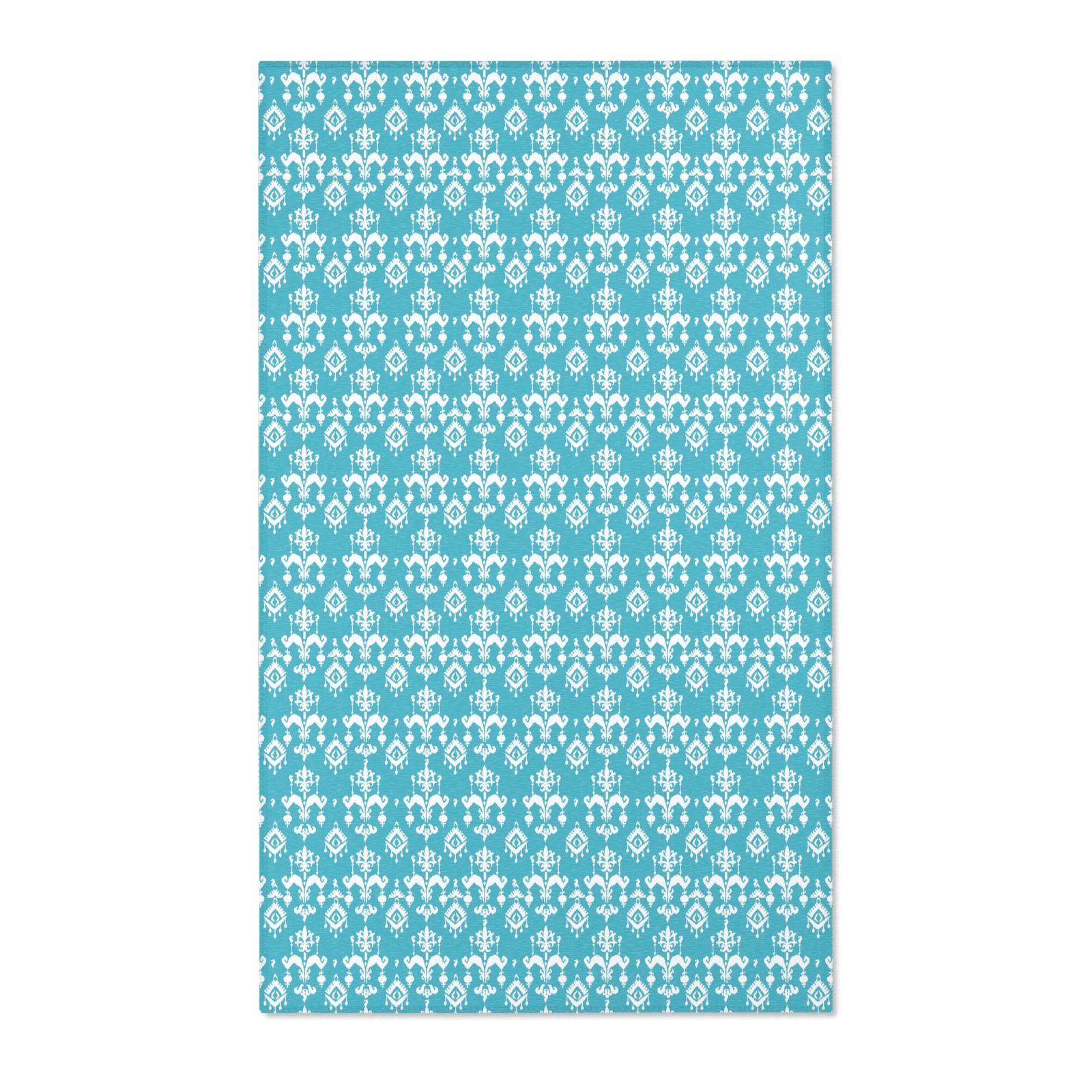 Available in 3 sizes – 24×36 inches, 36×60 inches and 48×72 inches, in rectangle shapes, this durable area rug will surely make a style statement in any room. Add playful, colorful or stylish graphics to effortlessly match your aesthetics. This area rug features hemmed edges and a coated backing, ready for any flat-lay design. Beautiful Digital ikat pattern blue area rugs and carpets