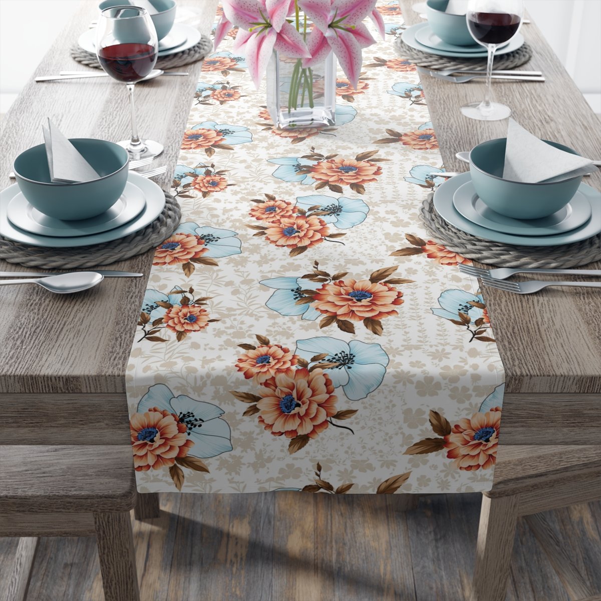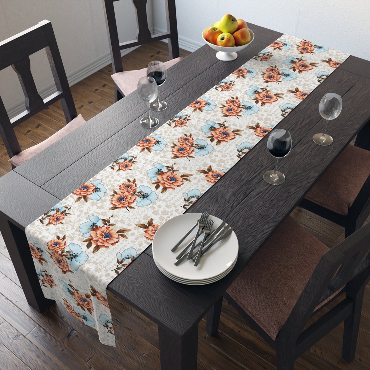 Enhance your dining experience with our Beautiful Orange Flower Print on Cream Table Runners for dining table. Made from high-quality materials, these vibrant runners feature a hand drawn orange floral print that adds a touch of elegance to any table setting. Whether hosting a dinner party or simply enhancing your everyday decor, these table runners are the perfect addition. Elevate your style and create a captivating ambiance with our Beautiful Orange Flower Print on Cream Table Runners.