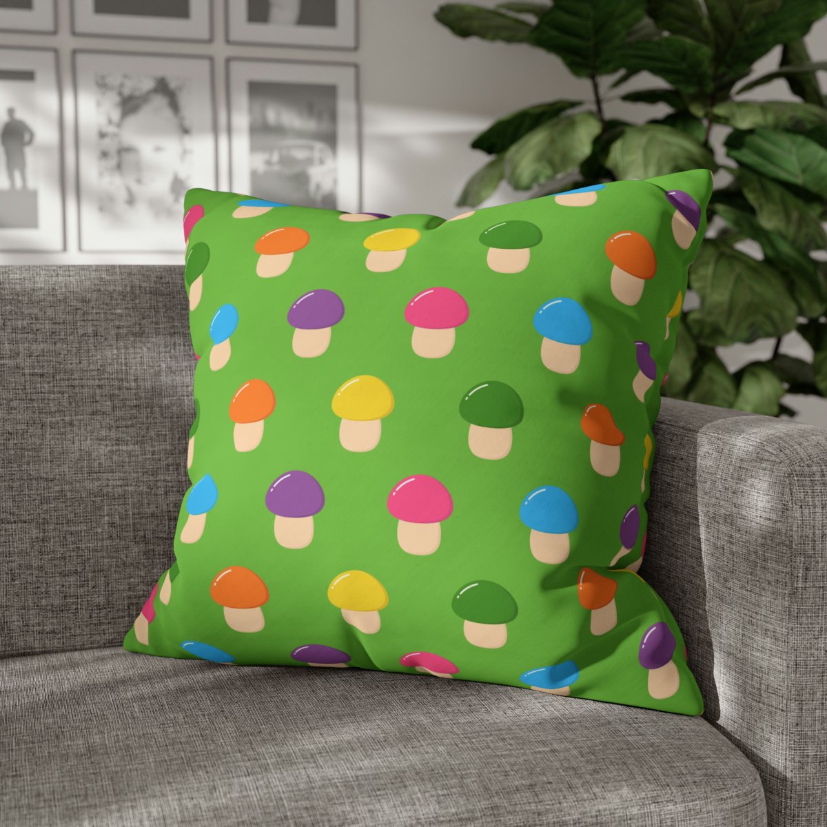 Colorful Mushrooms Print on Green Euro Pillow Shams