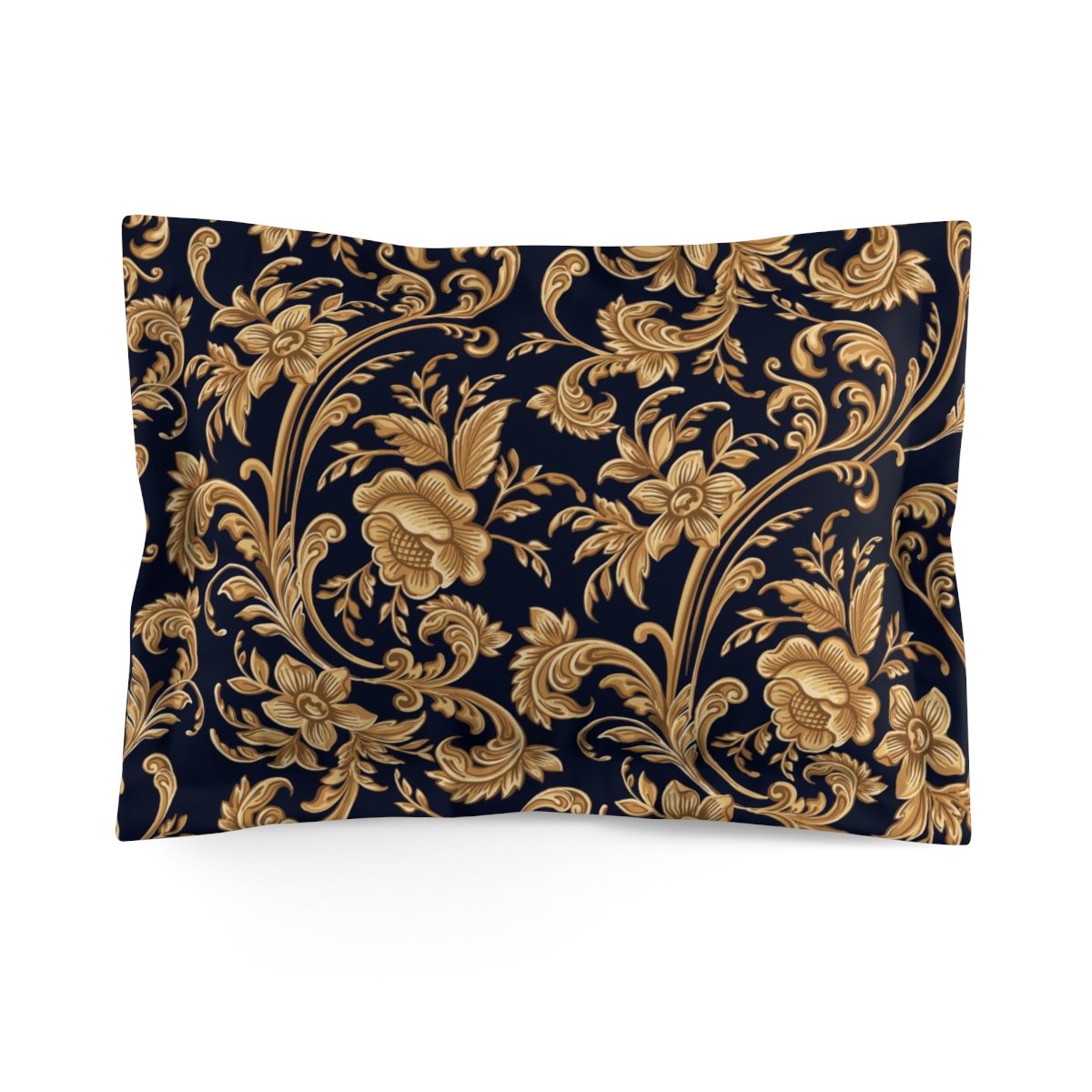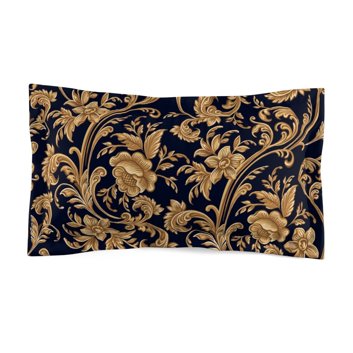 On the front side, these shams boast a stunning seamless pattern of decorative gold floral elements against a black backdrop. The intricate detailing and stylish design make them a standout piece, adding a touch of elegance and sophistication to your bedroom decor.