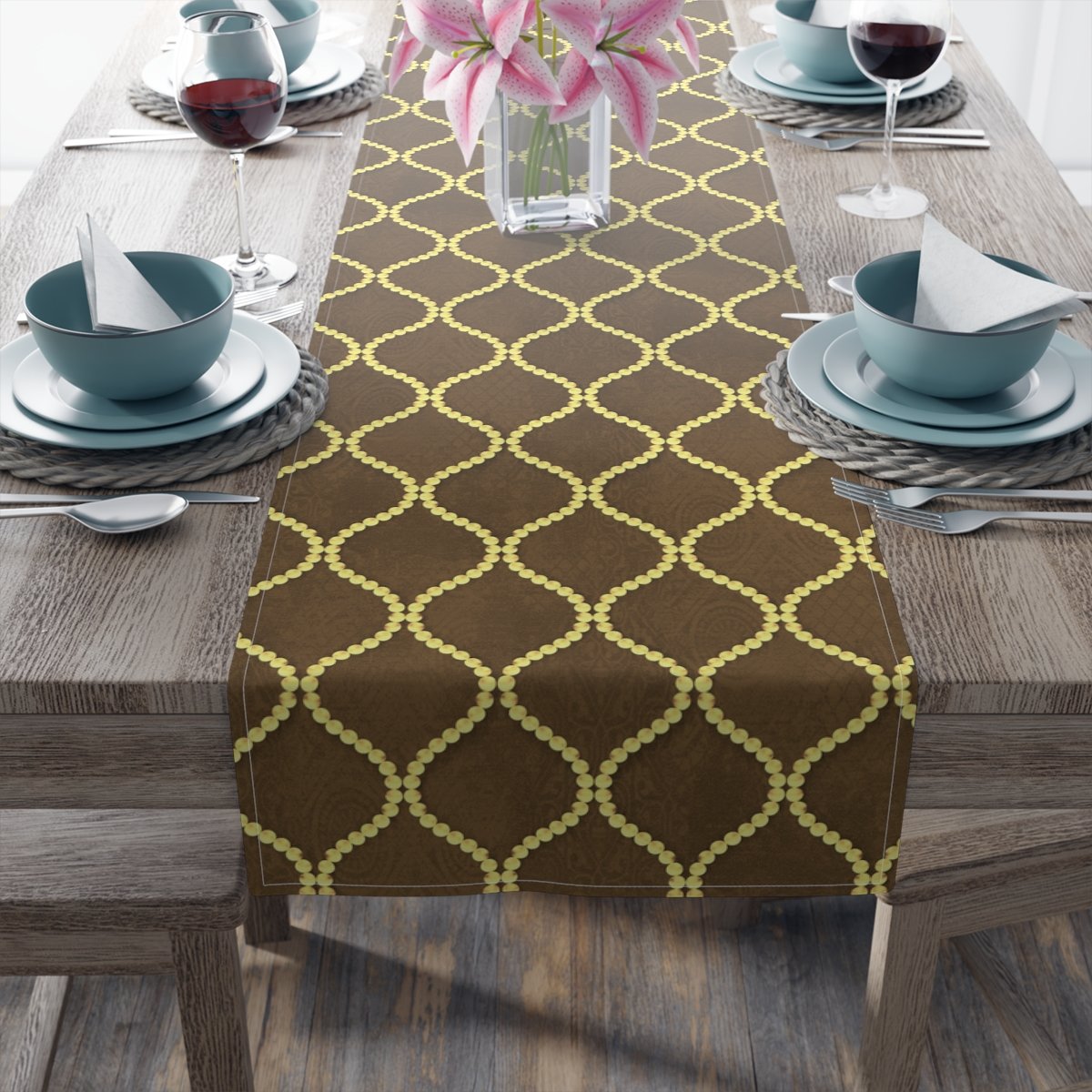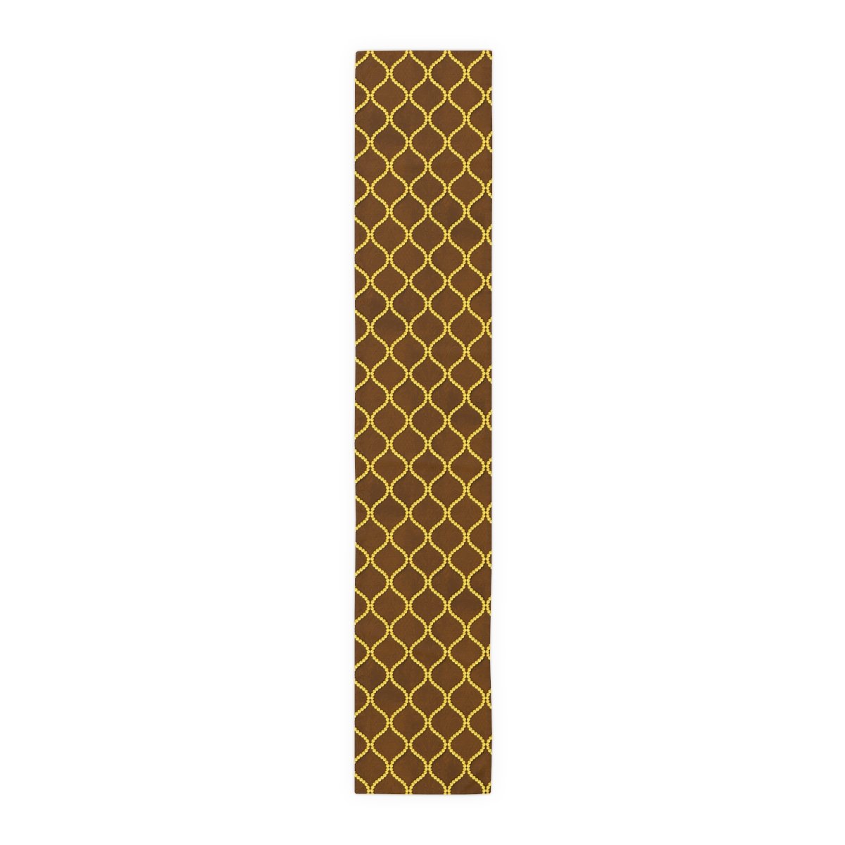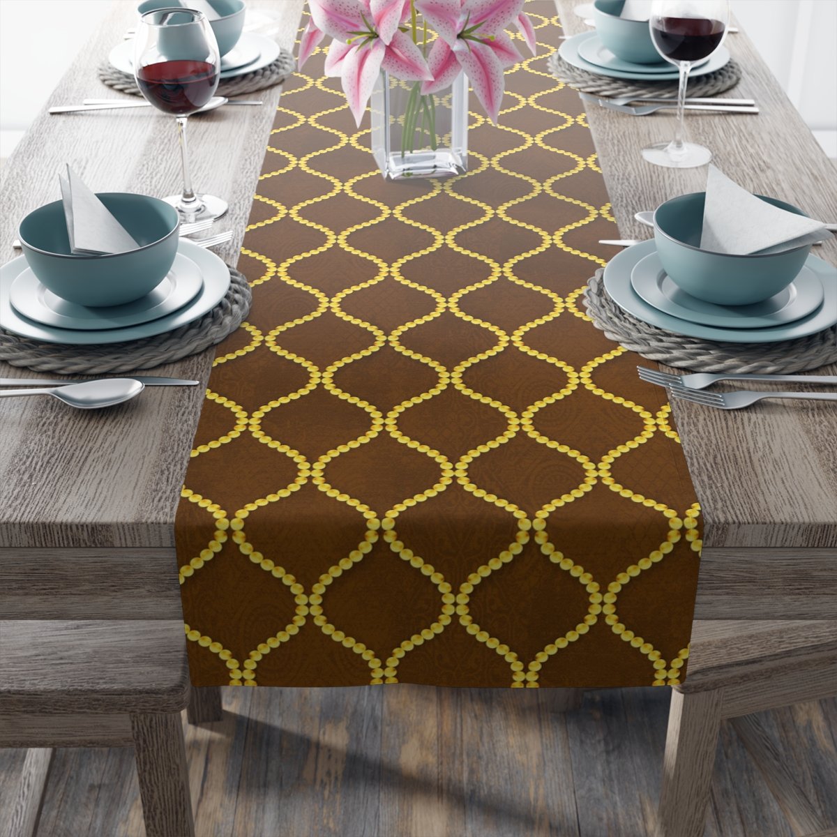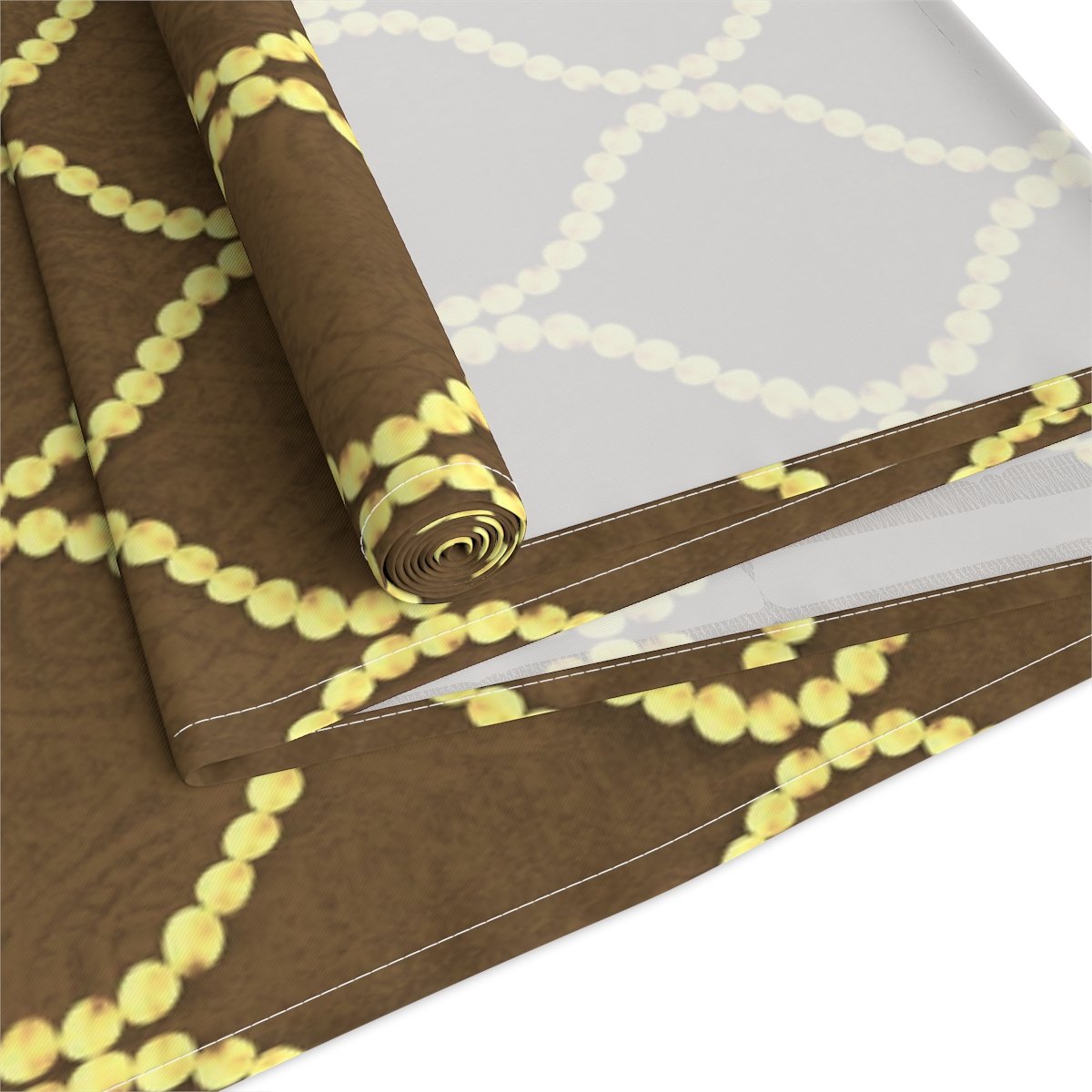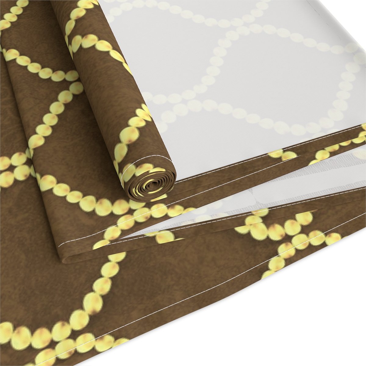 Enhance your dining experience with our Decorative Golden Wavy Line Pearls Brown Dining Table Runners. Made from high-quality materials, these vibrant runners feature a morccan pearls pattern that adds a touch of elegance to any table setting. Whether hosting a dinner party or simply enhancing your everyday decor, these table runners are the perfect addition. Elevate your style and create a captivating ambiance with our Decorative Golden Wavy Line Pearls Brown Dining Table Runners.