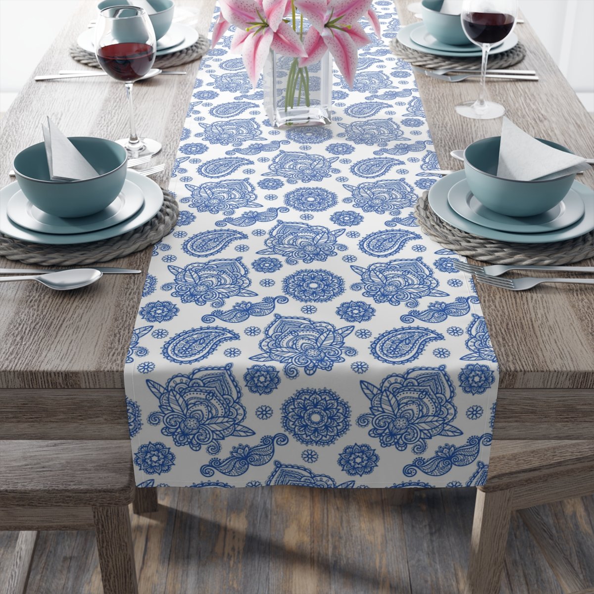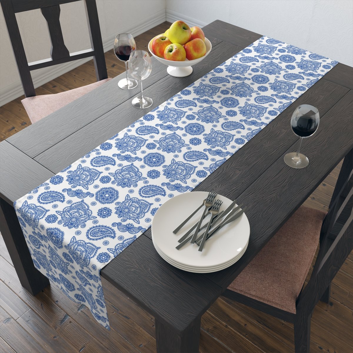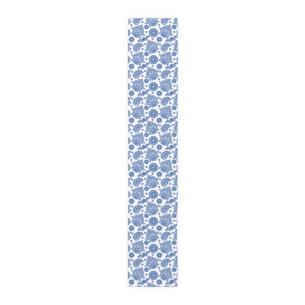 Introducing our Blue Paisley Tribal Art Table Runner, featuring a unique seamless pattern with a traditional ethnic ornament fabric design. The geometrically inspired tribal art adds a rich cultural feel to any table setting. Made with quality materials to ensure durability, this runner is perfect for everyday use or special events.