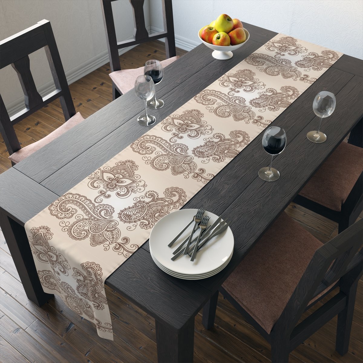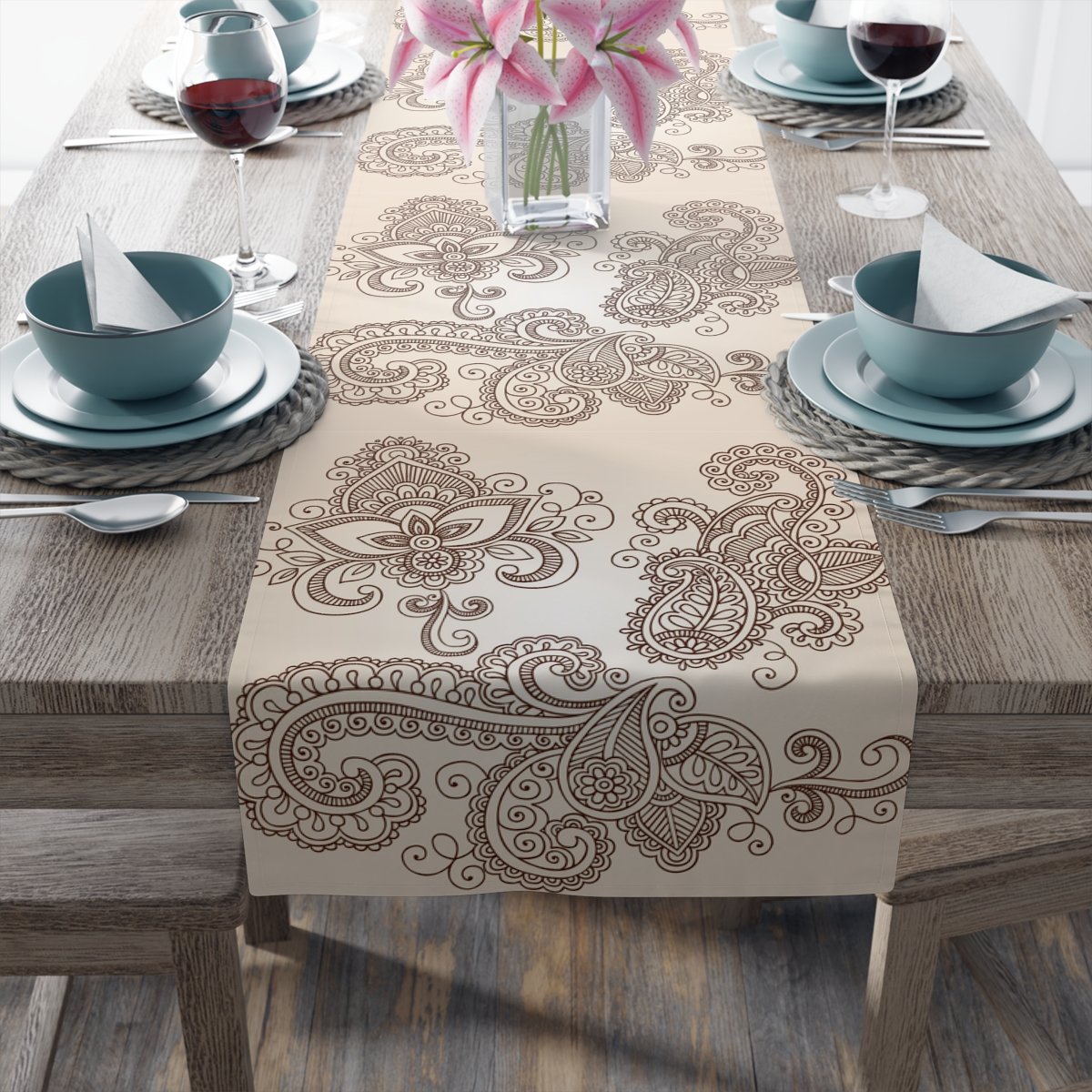 Available in beige and brown, these table runners come in two fabric options: cotton twill and polyester. The cotton twill fabric provides a soft and smooth texture, while the polyester fabric offers durability and easy maintenance. Elevate your dining experience with these stunning table runners that effortlessly blend traditional henna designs with contemporary style.
