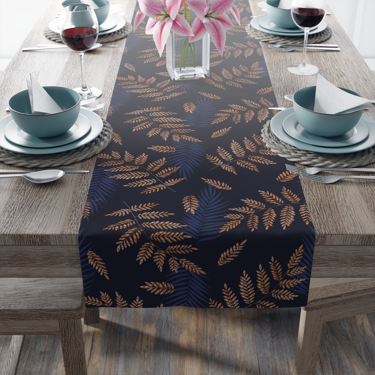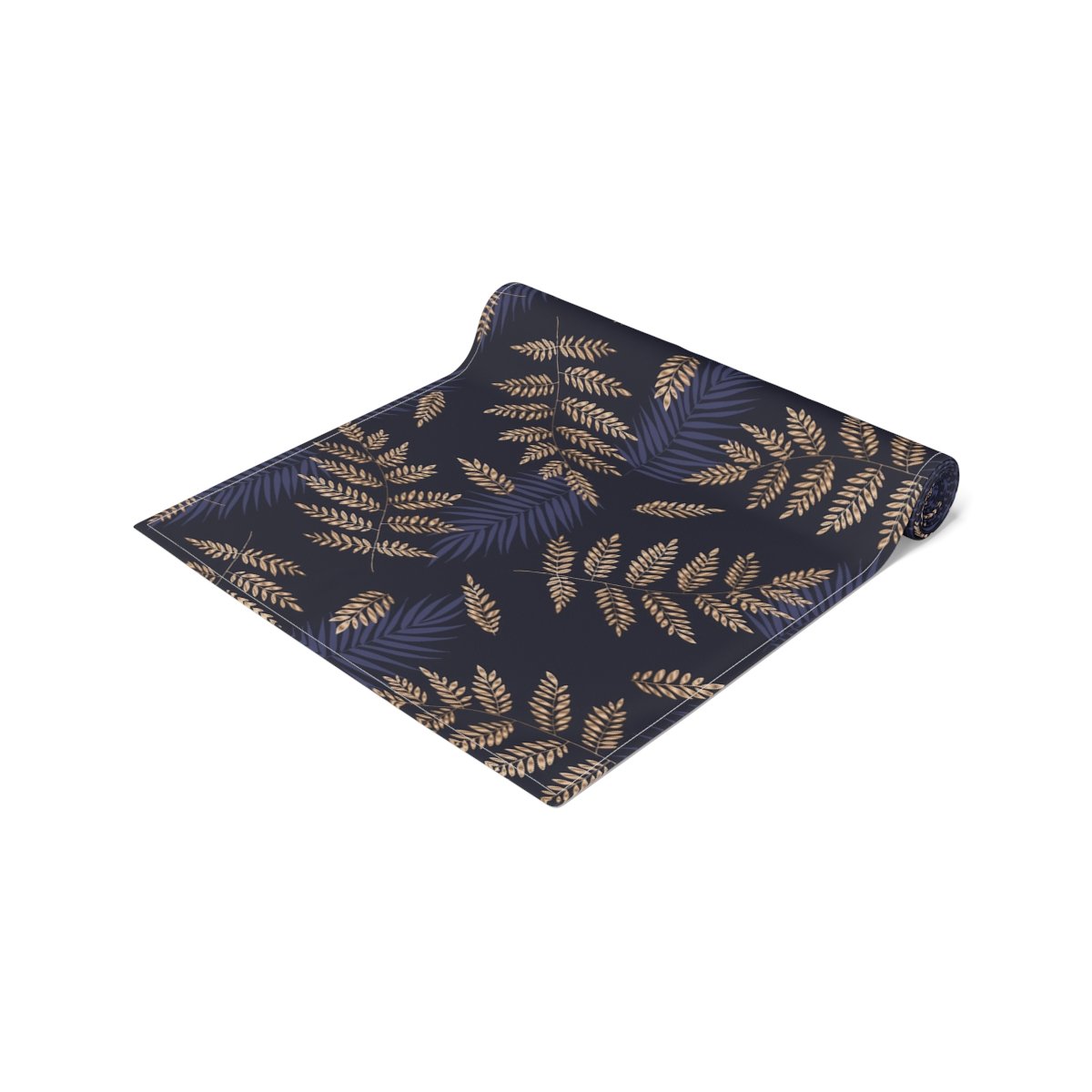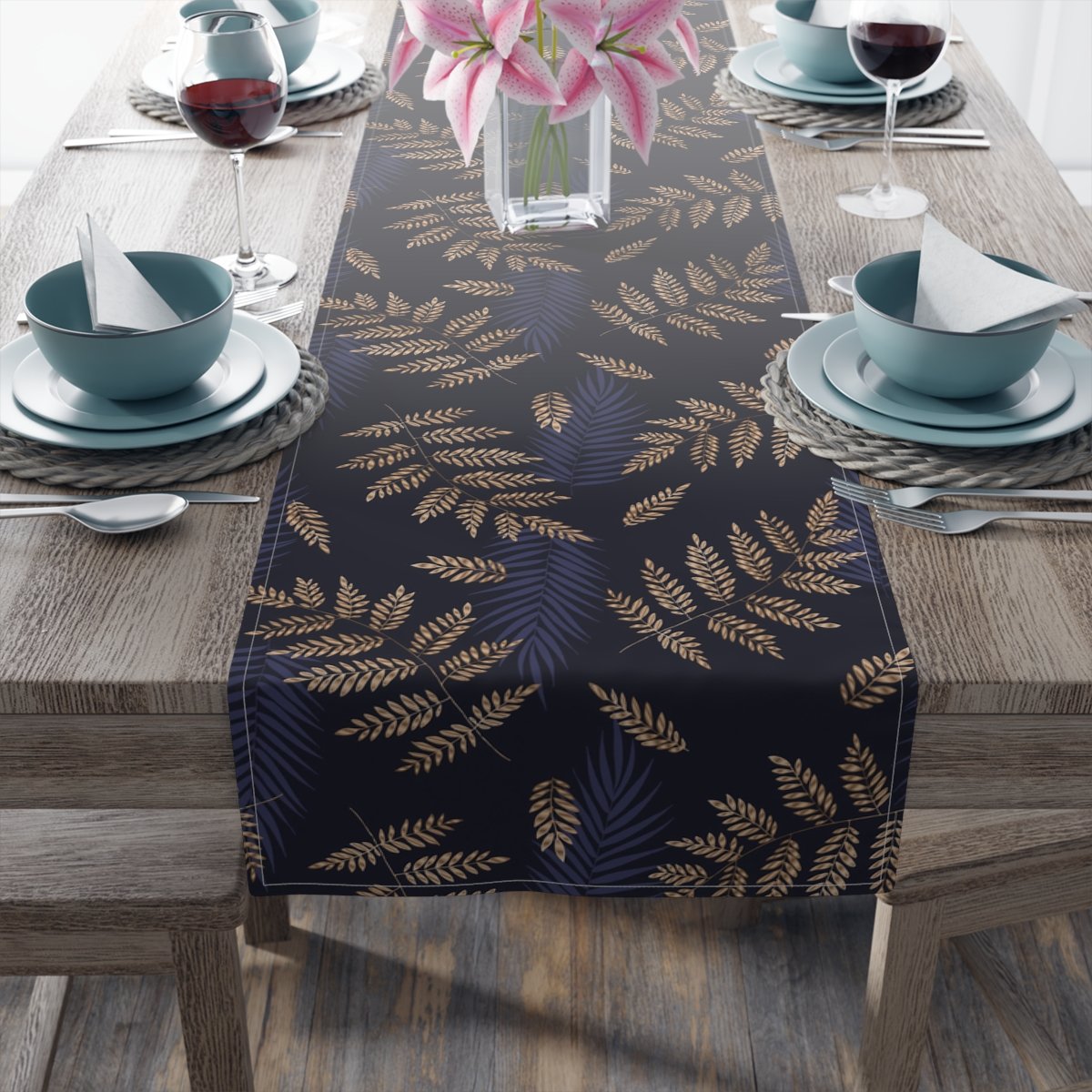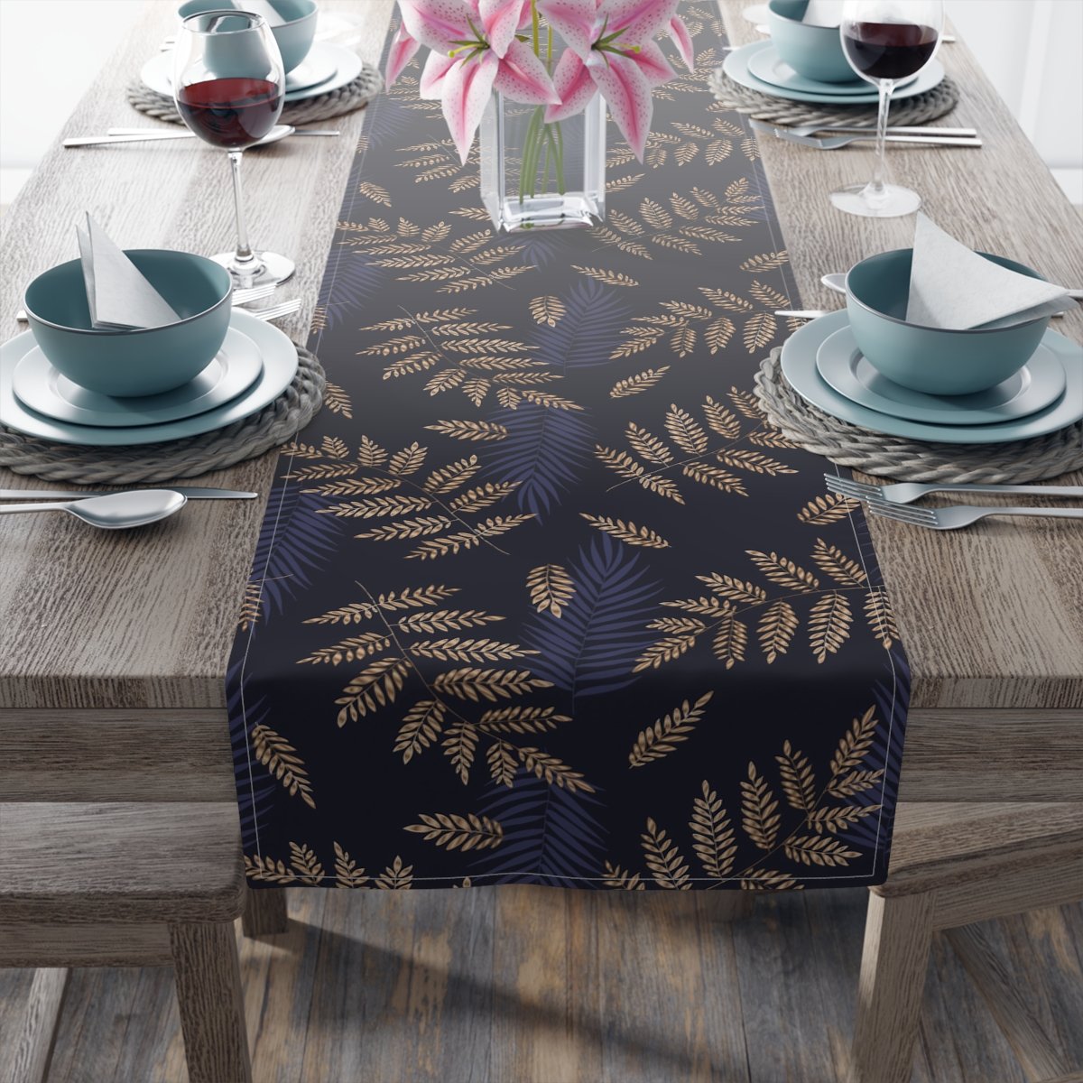 Tropical Fern Gold Pattern on Blue Dining Table Runners for 4 or 6 Seater